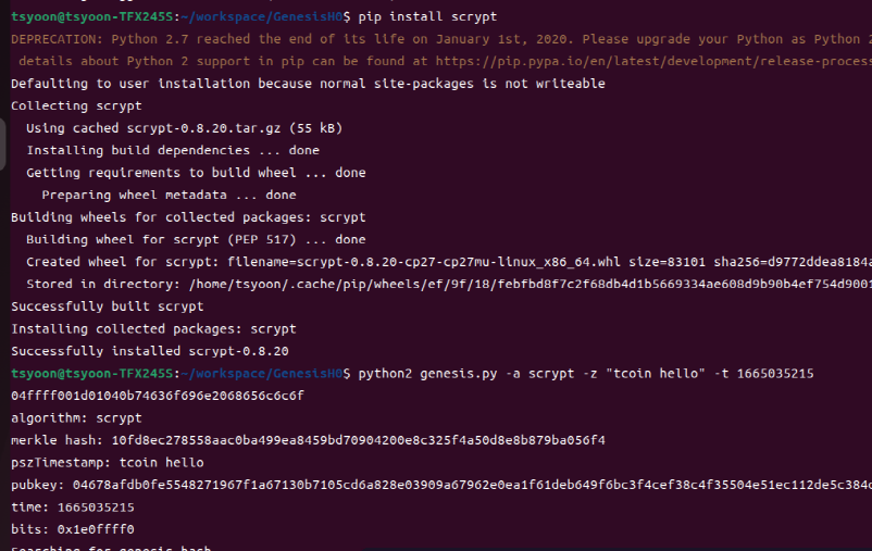 이렇게 하면 scrypt 파일도 잘 설치가 됩니다. 이후에 제네시스 블록 생성을 하면 제네시스 블록이 생성됩니다.