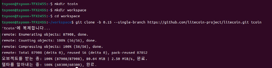 안녕하세요 ^\_^오늘은 수업시간에 배운 라이트코인 빌드 방법 정리를 해볼까 합니다.비번 입력해도 안보임 안틀리게 한글자씩 천천히 입력yes or no 질문 y 입력 후 Enter1입력 후 Enter~/workspace_jord/jo