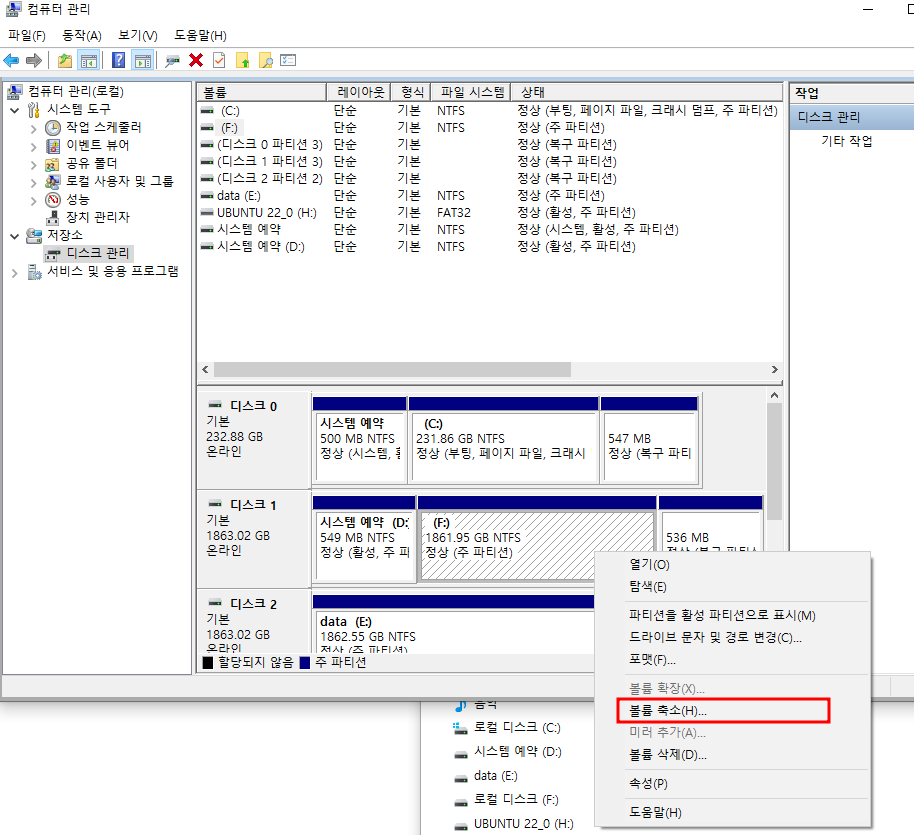 저장소 -> 디스크 관리 메뉴에서 우분투를 할당해야 할 공간에 볼륨 축소를 선택하세요.