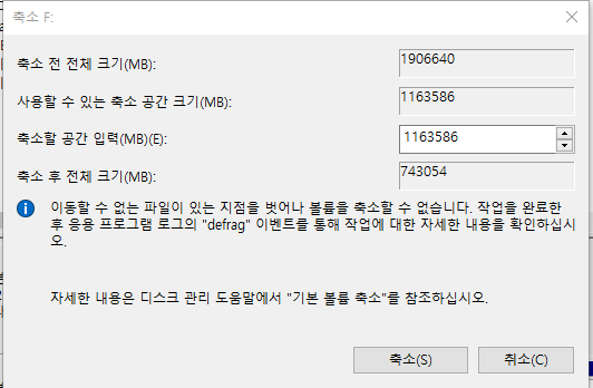 볼륨 축소 하는 것은 리눅스 설치공간을 확보하기 위함입니다.