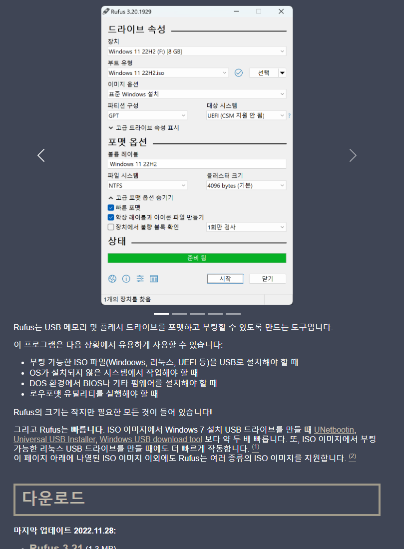 그리고, 파일을 다운 받은 후에 OS를 USB에 담아야 하는데 이때 필요한 프로그램이 rufus 프로그램입니다.