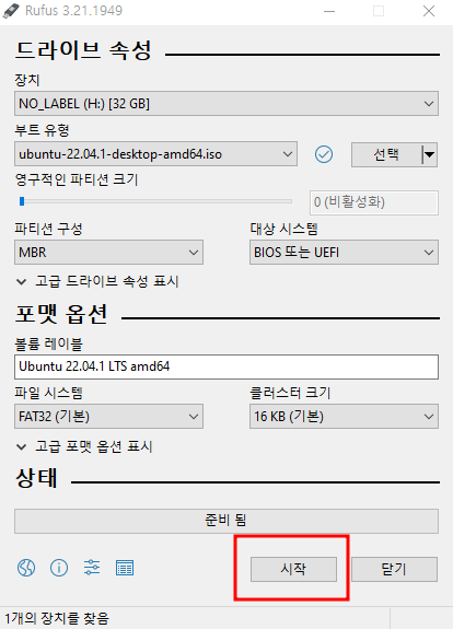 RUFUS를 실행해서 다운로드 받은 우분투를 USB 심어야 합니다.