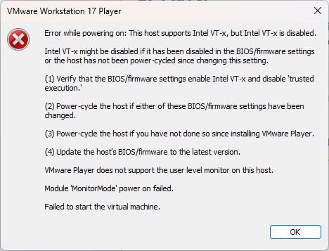 [오류 해결] VMWare - This host supports Intel VT-x, but Inter VT-x is disabled.