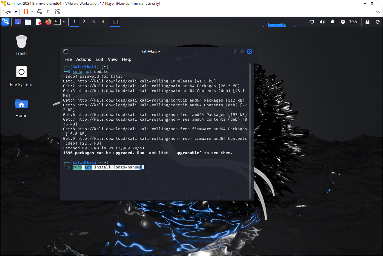 한글이 깨지는 문제는 터미널을 열고 다음 명령어를 순차적으로 입력하면 한글 설치가 완료됩니다.