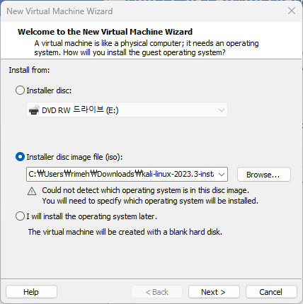 이제 본격적으로 kali 리눅스를 가상환경에 설치하는 과정입니다.