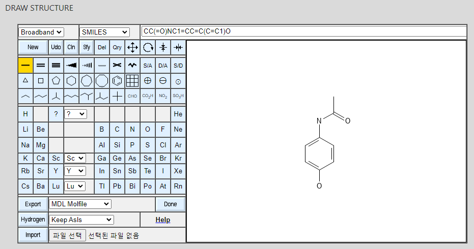 도형 하나 그려 넣는데 힘드네요. 선을 하나몇 개 더 연결하면 아세트아미노펜이 만들어 질 것 같은데, 그림이 쉽지는 않네요. 그냥 SMILES 형식을 입력해 봅시다. CC(=O)NC1=CC=C(C=C1)O 입니다.