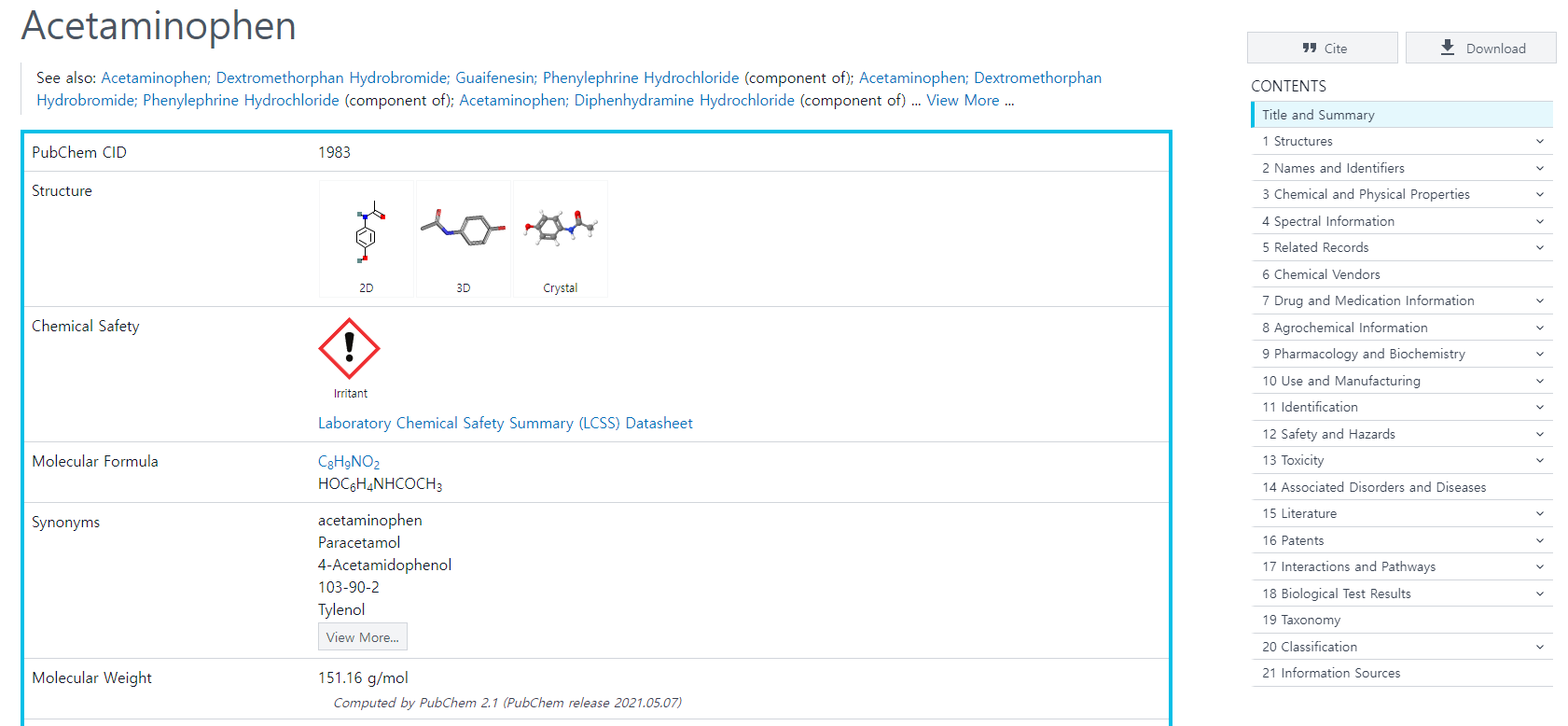 약물 분석할때도 분자 구조식을 확인할 때도 사용하는 사이트가 pubchem입니다.