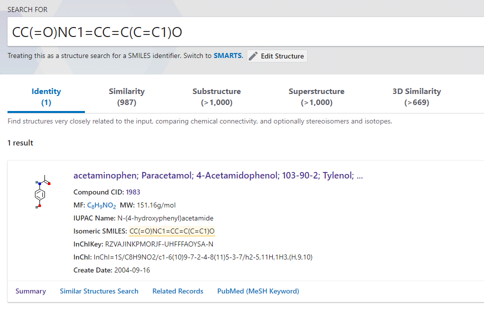 일치되는 분자식이 1개가 있네요. SMILES에 대한 내용도 나오고 있고요.