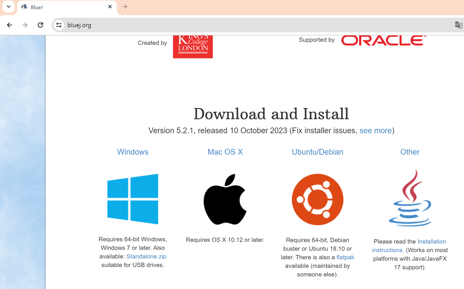 www.bluej.org 사이트에 접속한 후 운영체제를 선택해서 설치 파일을 다운로드합니다.