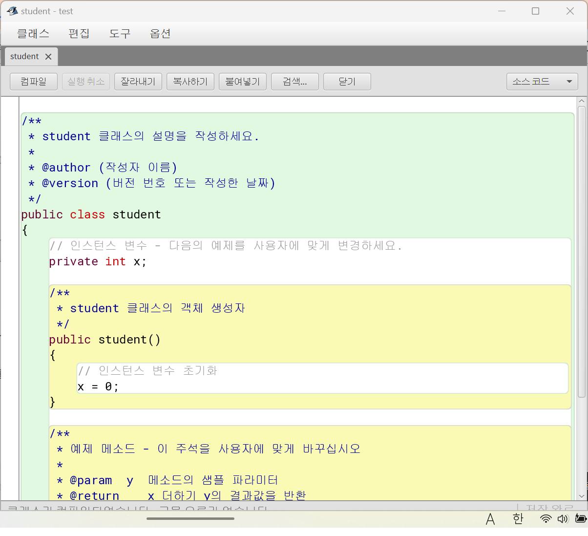 주석도 넣을 수도 있고, 메소드를 색상별로 입력하면서 들여쓰기를 할 수 있습니다.