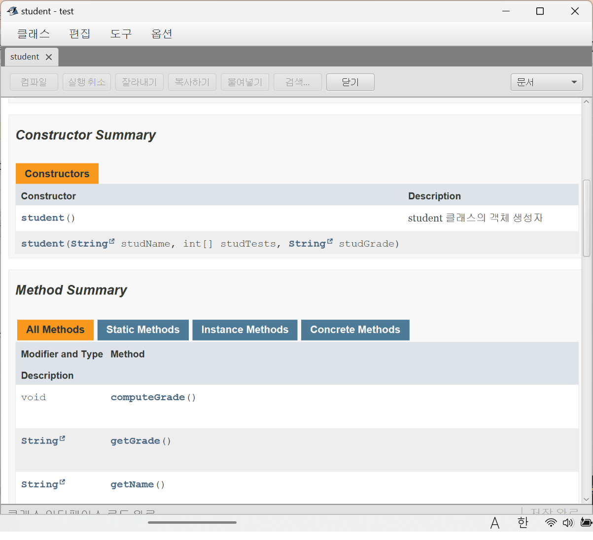 문서 메뉴를 선택하면 문서화된 내용이 나와서 생성자와 메소드 형식을 요약하여 볼 수 있습니다,. ''