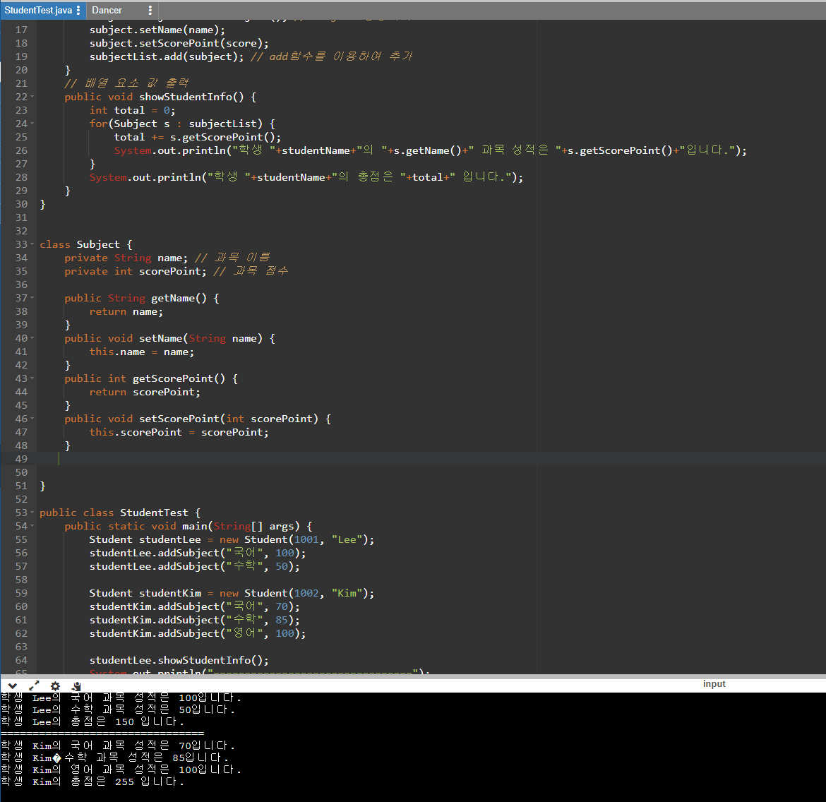 studentLee.addSubject("국어", 100);