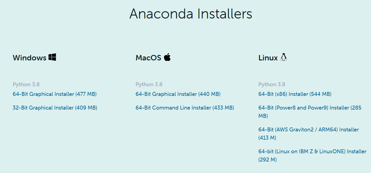 아나콘다 설치를 위해서는 다음 사이트에 가서 운영체제에 맞는 파일을 찾아서 설치하면 됩니다.