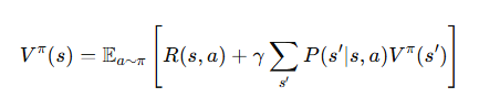 이 식은 정책 π를 따를 때 상태 s의 기대 보상이 현재 보상과 다음 상태의 가치의 기대값으로 구성되어 있음을 보여줍니다.