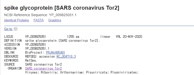 Accession 메뉴에 있는 YP_009825051.1 가 있는 서열정도들이 나오는데 2020년 11월 바이러스인것이 확인됩니다. 시기적으로 보니 델타 전이 바이러스의 시작전이라고 볼 수 있겠네요.