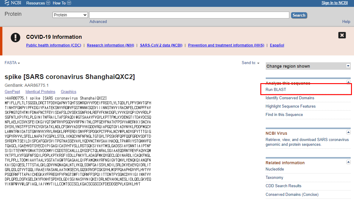 블라스트를 불러서 비슷한 서열들을 찾아보려면 우측 상단에 있는 "Run Blast"를 선택하면 됩니다.