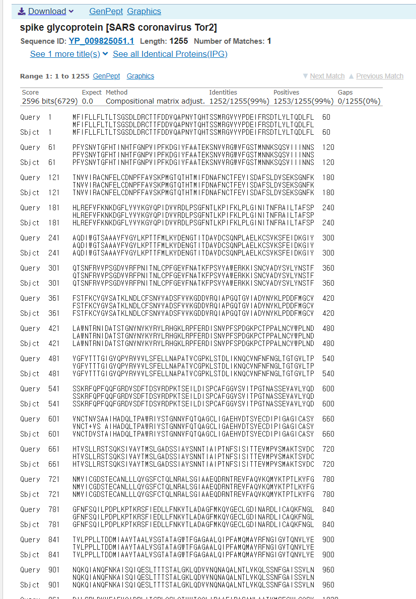 특이한 점이 있는데 identities 를 보니 99.76%에 YP_009825051.1가 있는데 이 서열은 SARS coronavirus Tor2입니다. 이 바이러스는 최근에 업로드 된 것입니다.