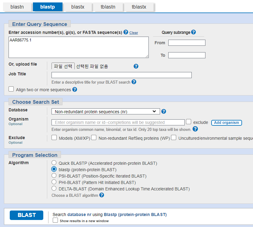 블라스트는 5개의 메뉴가 있는데 위에 blastp는 프로틴 - 프로틴에 대한 검색입니다. 현재 서열이 프로틴이므로 프로틴을 검색하겠다는 메뉴인 것이죠. 블라스트 메뉴들에 대한 설명은 차후에 다른 링크에서 진행하겠습니다.