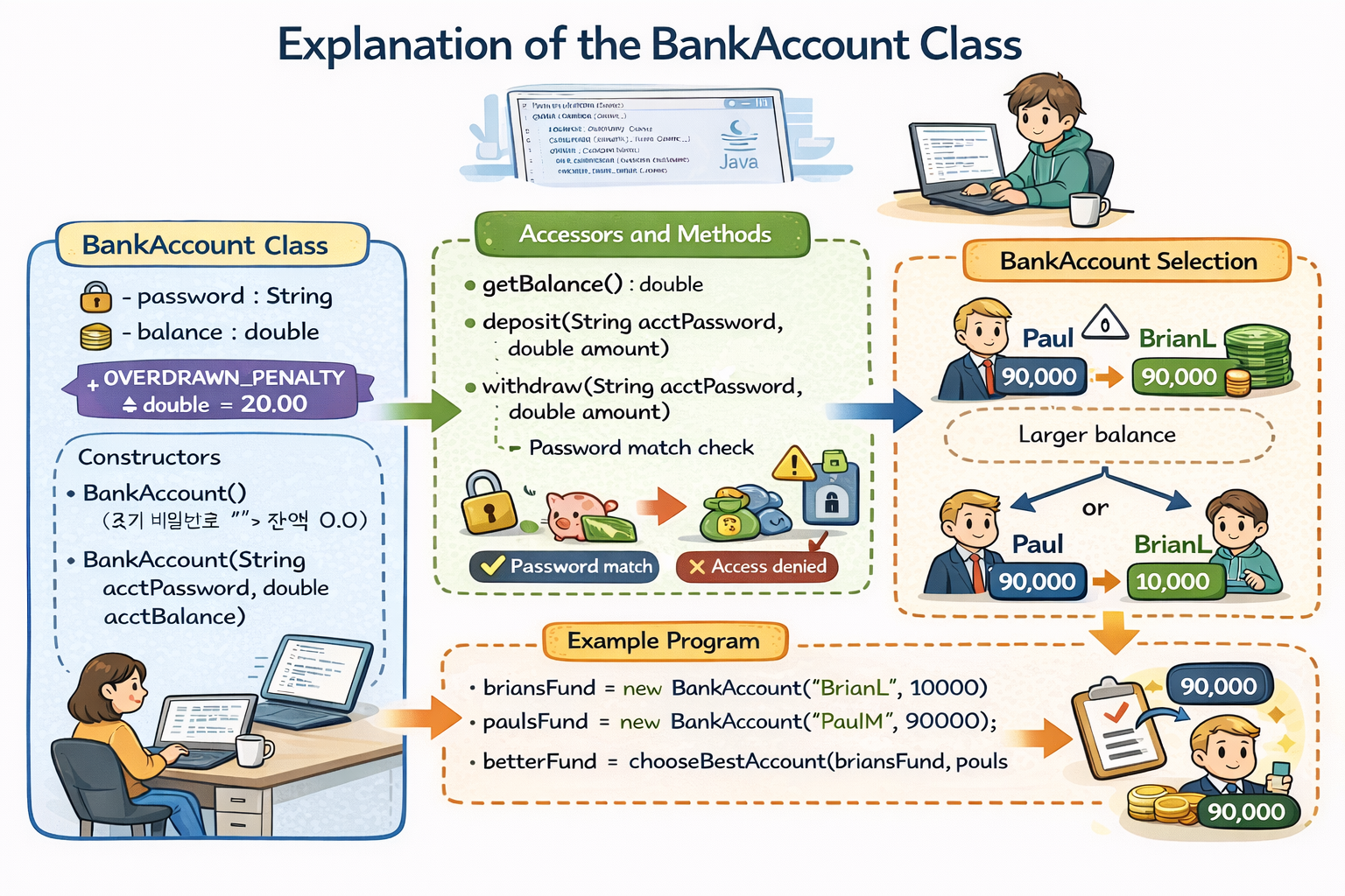 BankAccount 예제입니다. 변형을 많이 만들 수 있는 예제이며 위 예제에서 출제되는 문제들이 많이 있습니다.