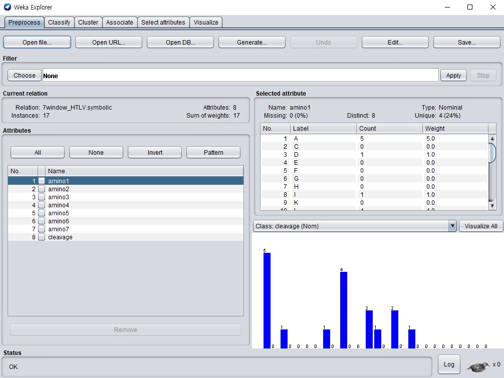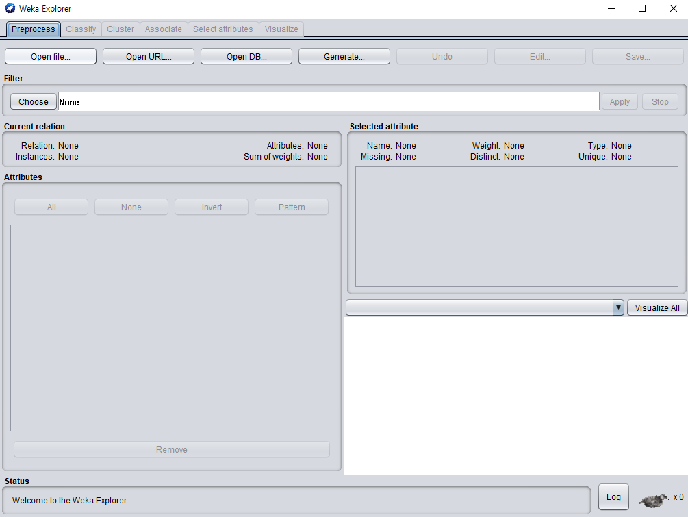 WEKA Explorer 실행 화면인데 화일의 확장자는 arff 입니다.