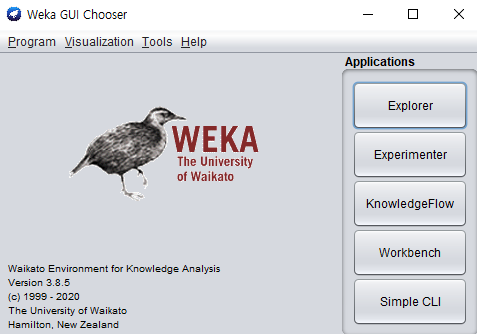 WEKA 홈페이지에 들어가서 다운로드 받으면 됩니다. 자바를 기반으로 만들어진 프로그램입니다. 설치할 때 JVM이 설치가 되어야 사용이 가능합니다.