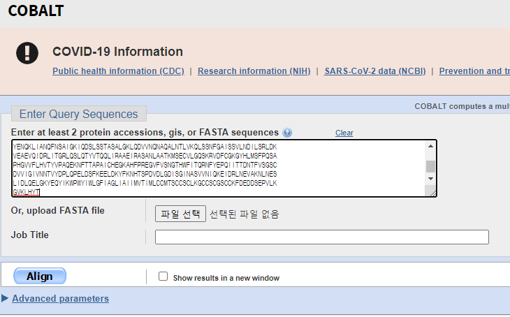 COBALT는 멀티플 정렬 메뉴로 여기서 위 5개의 FASTA 내용을 입력한다.