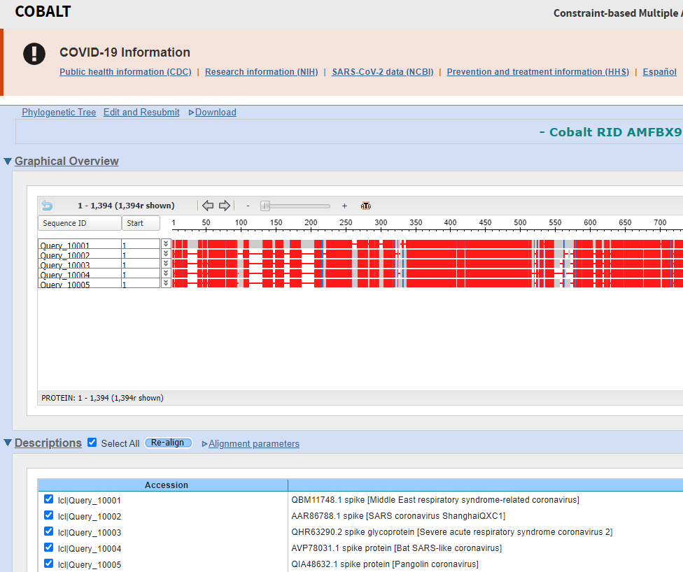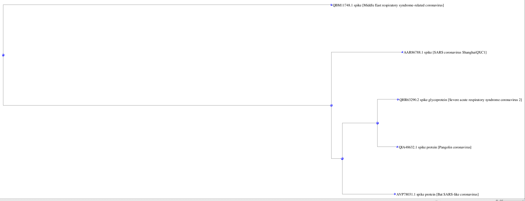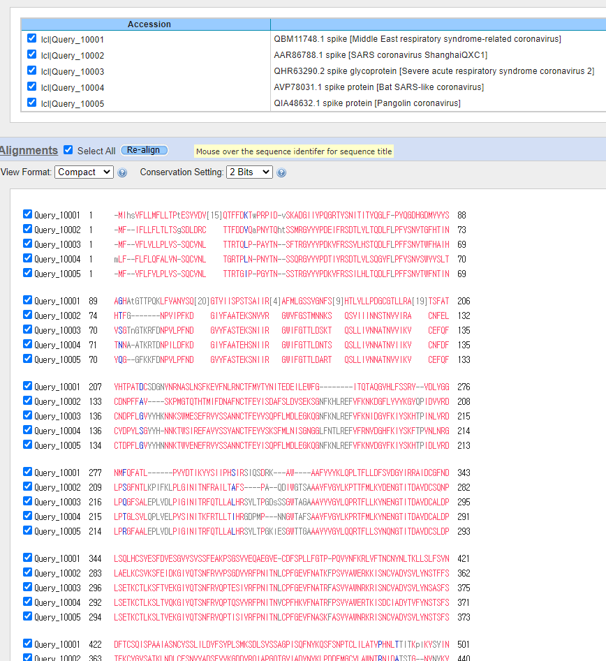 또 하나는 AAR86788.1 - SARS , QHR63290.2 - corona2, AVP78031.1 - Bat, QIA48632.1 - Pangolin