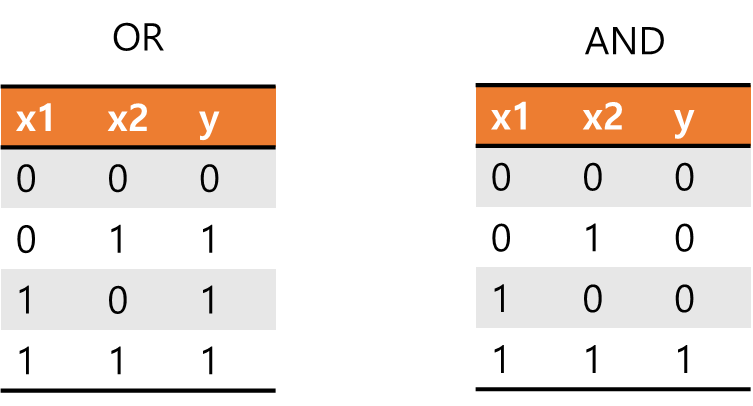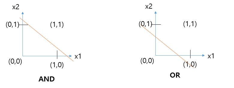 이렇게 입력값 2개를 가지고 학습(Training)을 하면 OR에 대한 학습과 AND에 대한 학습으로 선형 방정식으로 결과가 나옵니다. 이렇게 해서 퍼셉트론이 시작되었습니다.