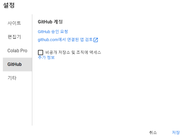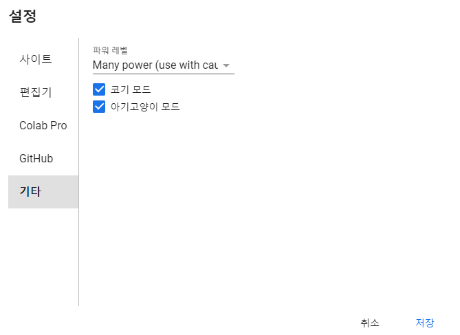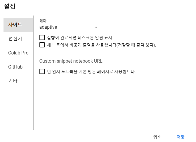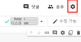 Colab에서는 컴퓨터의 CPU과 RAM 환경을 볼 수 있으며 테마를 이용한 환경설정도 가능합니다.