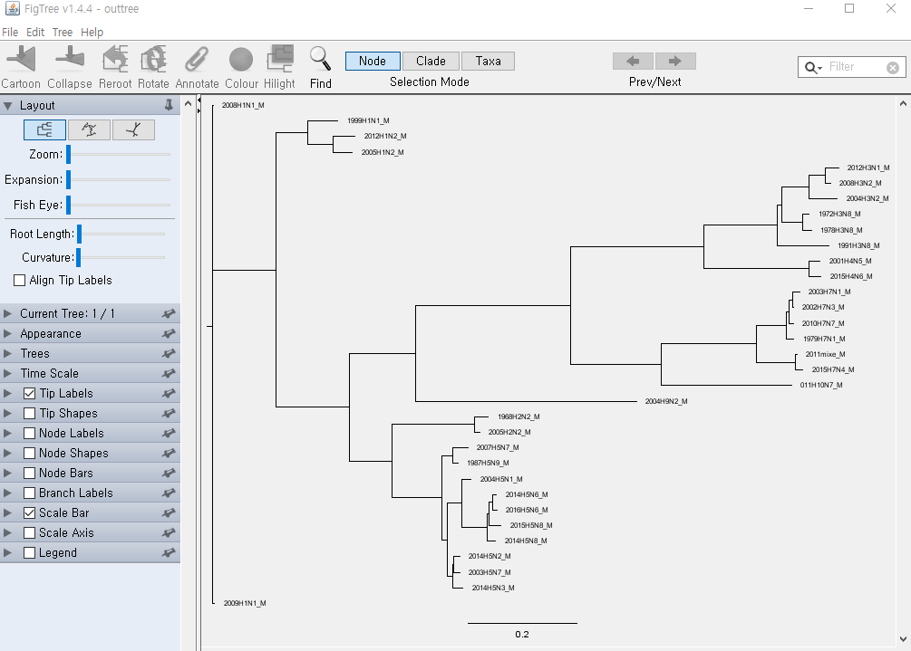 Fig Tree를 설치하고 outfile 을 불러오면 다음과 같은 결과나 나옵니다.