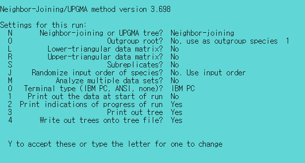 이 outfile을 input으로 이름을 바꾸고 neigbor 명령어를 실행하면 NJ tree가 파일로 저장됩니다.