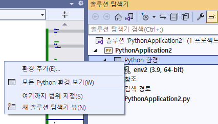 이제 텐서플로우 설치하면 됩니다. 오른쪽 설루션 창에서 오른쪽 마우스 버튼을 누르고, 환경 추가 창을 열어보세요.