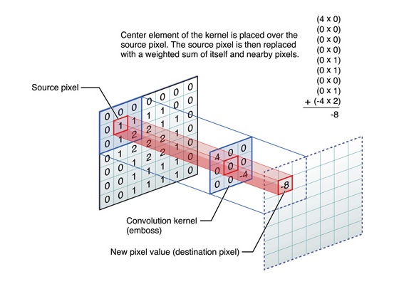 소스 픽셀이 000 011 012 이며 컨볼루션 커널을 400 000 00(-4) 값으로 만들어 놓으면 행렬의 내적 연산을 통해 -8 값을 만들어 낼 수 있는데 이를 좀 더 자세하게 표현 내용은 아래에 있습니다.
