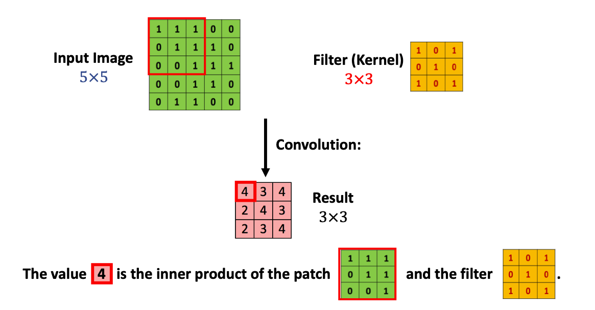 5*5에서 3*3을 잘라서 필터를 응용해서 연산식을 만드는데 4로 결과가 나오는 것은 입력값에 대한 변환을 통해 가능합니다. 여기서 변환이라는 것은 수학적 방법을 적용해서 공식을 변화시킨 내용입니다.