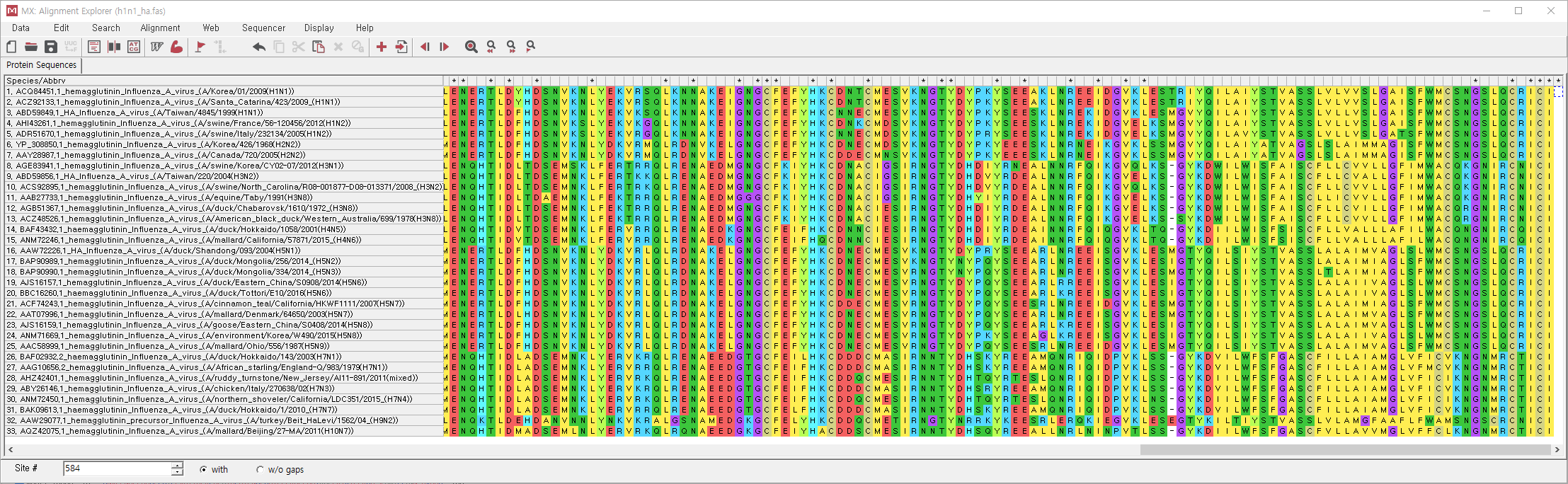 위에 그림은 MEGA-X에서 헤마글루티닌 FASTA 형식 예제를 불러와서 Align by ClustalW를 실행한 후 결과입니다.