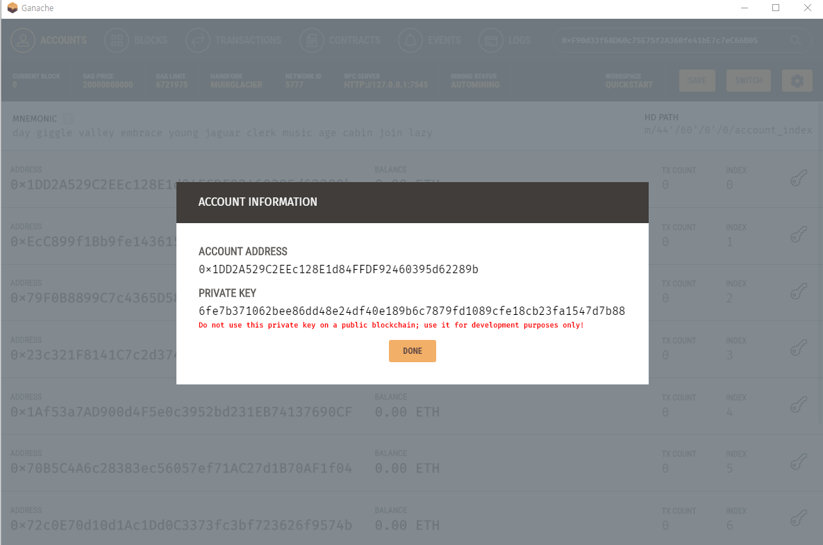 설치 후에 가나슈 화면을 띄우면 다음과 같은 화면이 나오는데 각 계정 주소마다 할당 된 이더값들이 나타납니다.