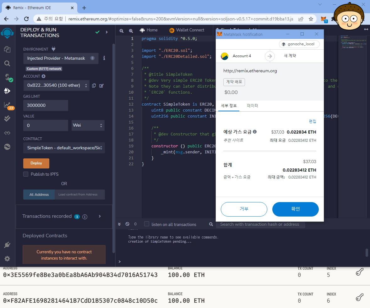 Remix와 메타마스트와 가나슈를 띄워 놓고, SimpleToken.sol 컴파일 후에 Deploy 적용한 내용입니다.