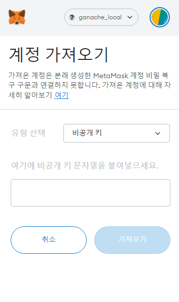 가니슈 화면에서 아무 주소 값을 열면 Private Key값이 나옵니다. 그 키값을 복사한 후에 계정 가져오기 비공개 키 문자열 붙여 넣으라는 곳에 붙여 넣으면 됩니다.