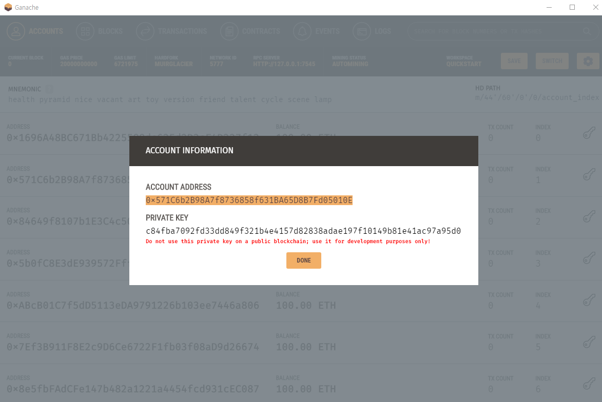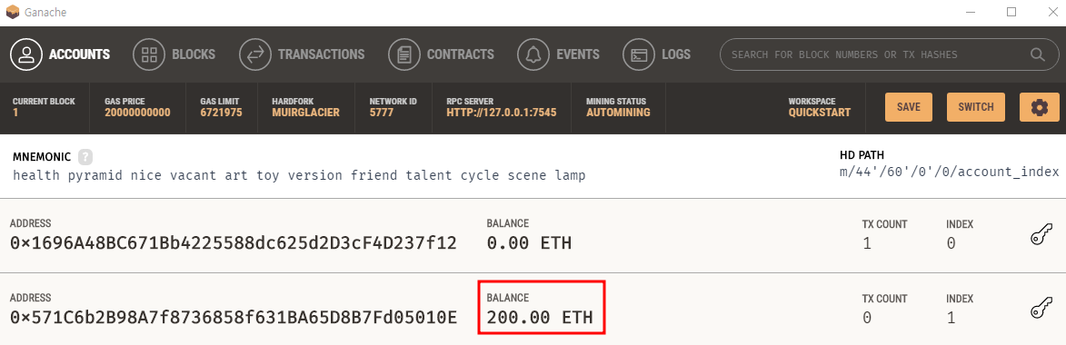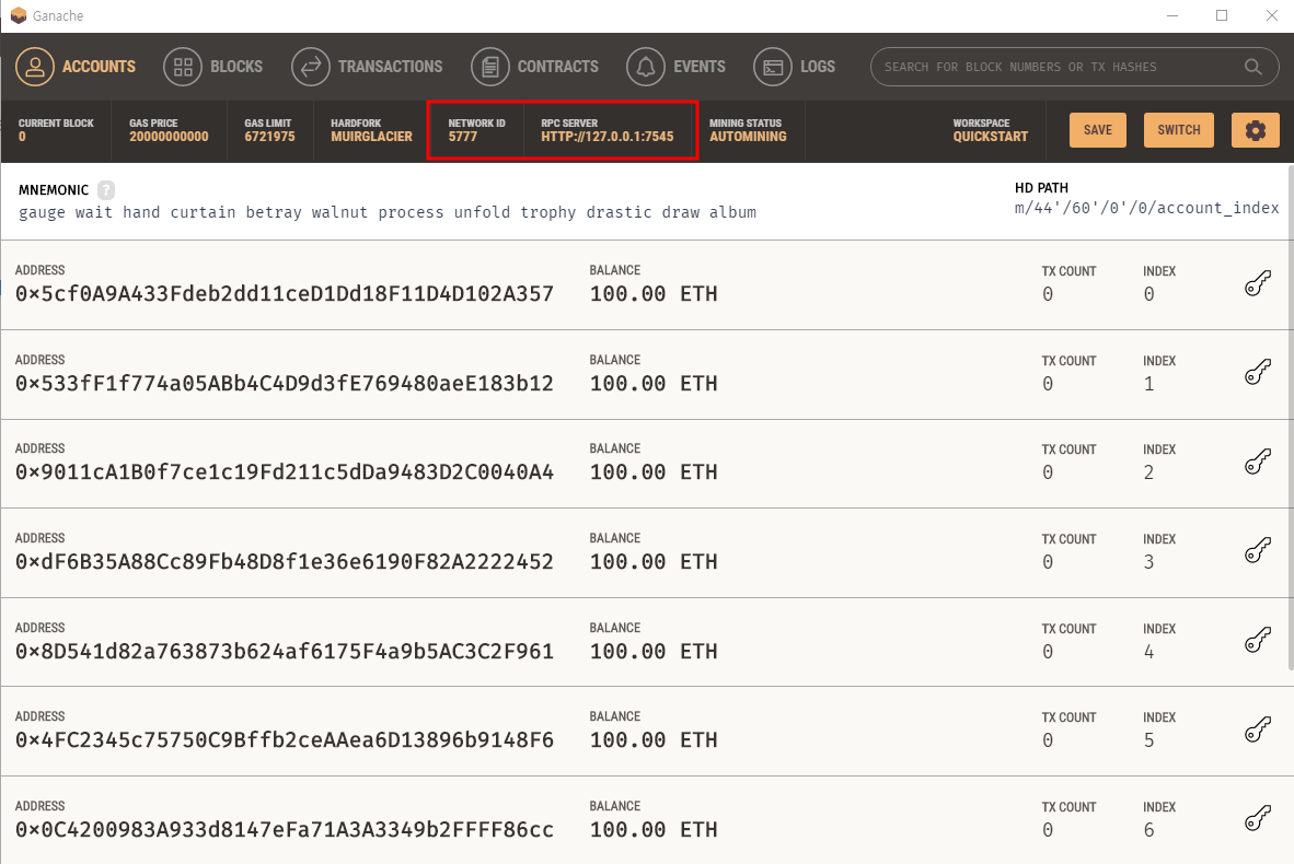 Features VISUAL MNEMONIC & ACCOUNT INFO Quickly see the current status of all accounts, including their addresses, private keys, transactions and balances.