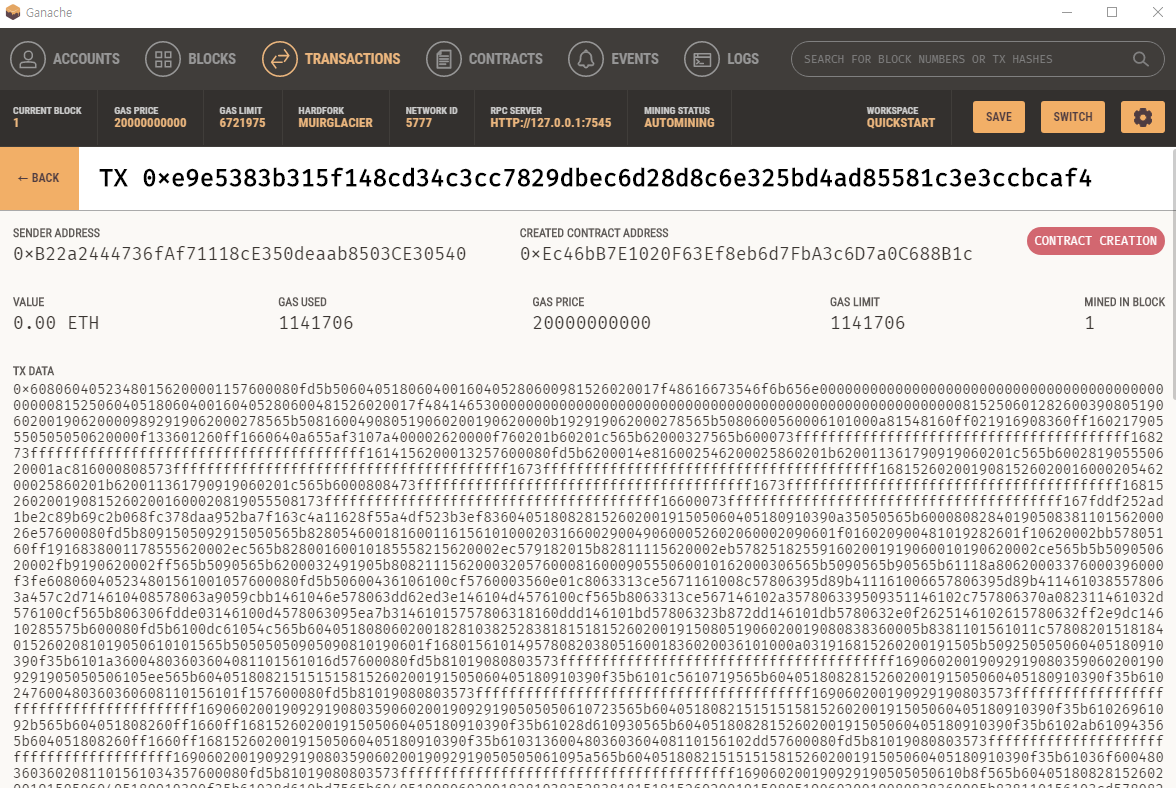 TRANSACTIONS 메뉴에서는 스마트컨트랙트에 대한 배포 내용을 알 수 있습니다.