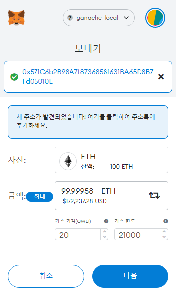 반대로 이더 보내기를 선택하려면 가나슈 화면에서 아무 주소를 선택하고 Account Address 값을 복사합니다.